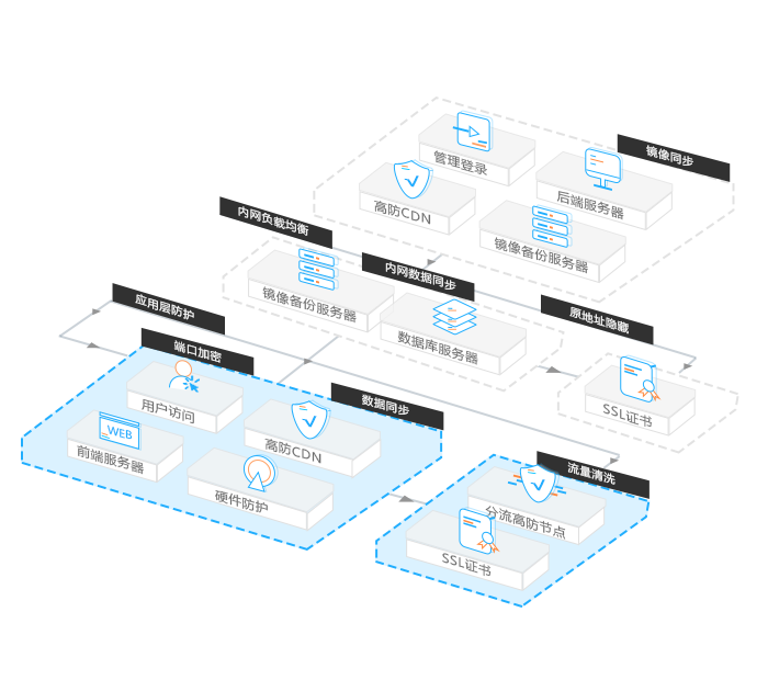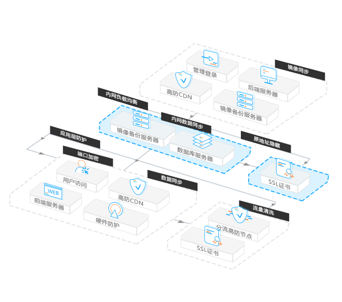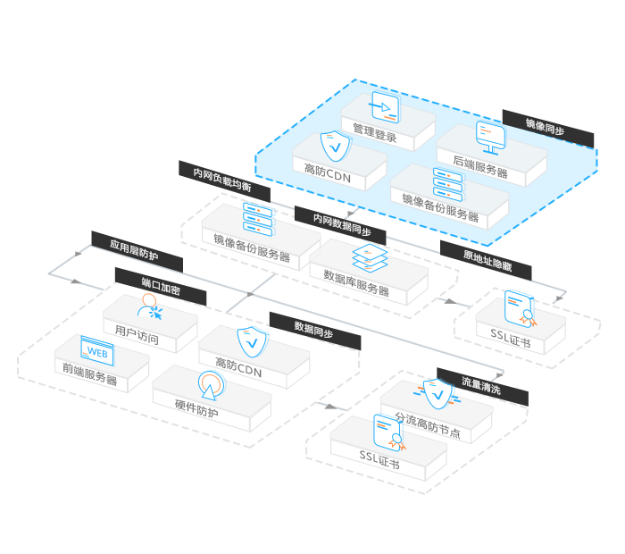 整体架构在关键点采用独立硬件防护和SSL安全证书,高防CDN缓解业务高峰和攻击带来的网络拥堵